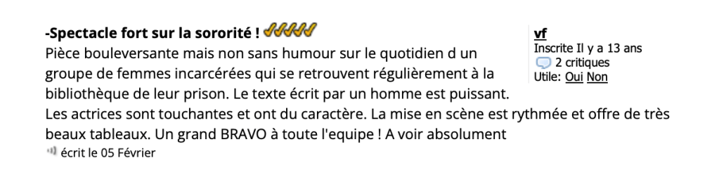 Dans une vie rythmée par la rigidité de l’univers carcéral, c’est l’histoire d’une évasion: celle de six femmes qui vont survivre grâce à leur imagination, à la littérature et au théâtre. Elles vont se jouer de la réalité pour transcender leur condition, réinventer un présent, un espace dans lequel elles trouvent leur place et existent réellement.
