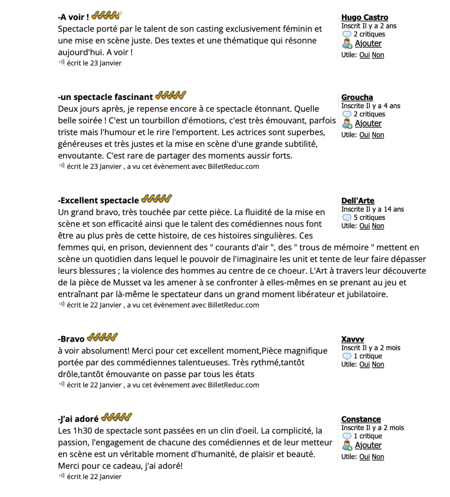 L’Art à travers leur découverte d’une pièce d’Alfred de Musset va les amener à se confronter à elles-mêmes en se prenant au jeu et entraînant par là-même le spectateur dans un grand moment libérateur et jubilatoire.