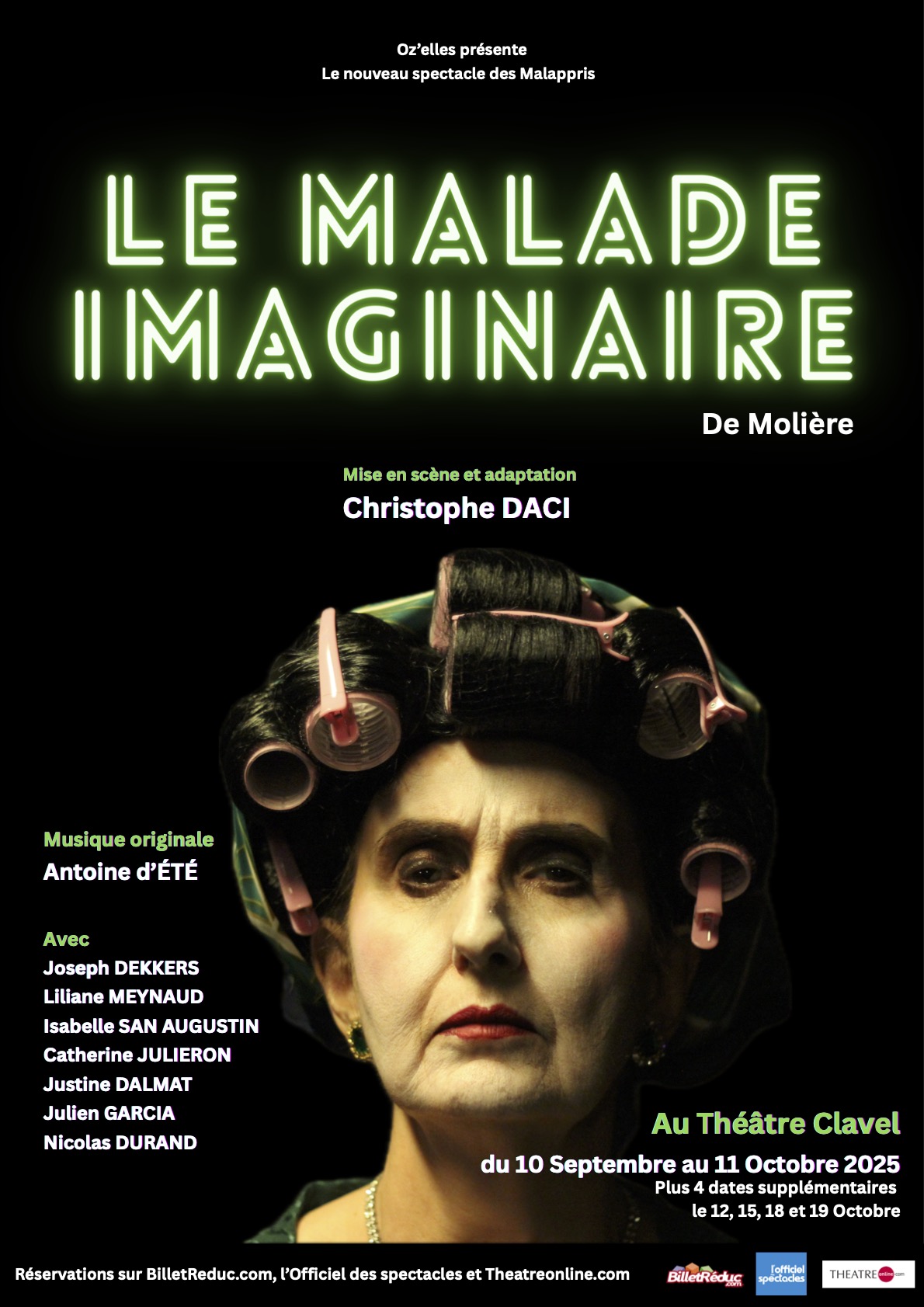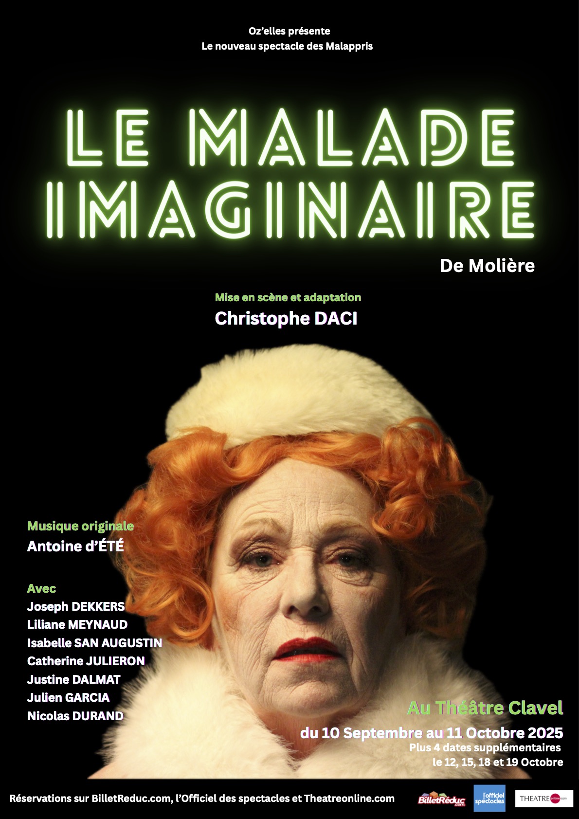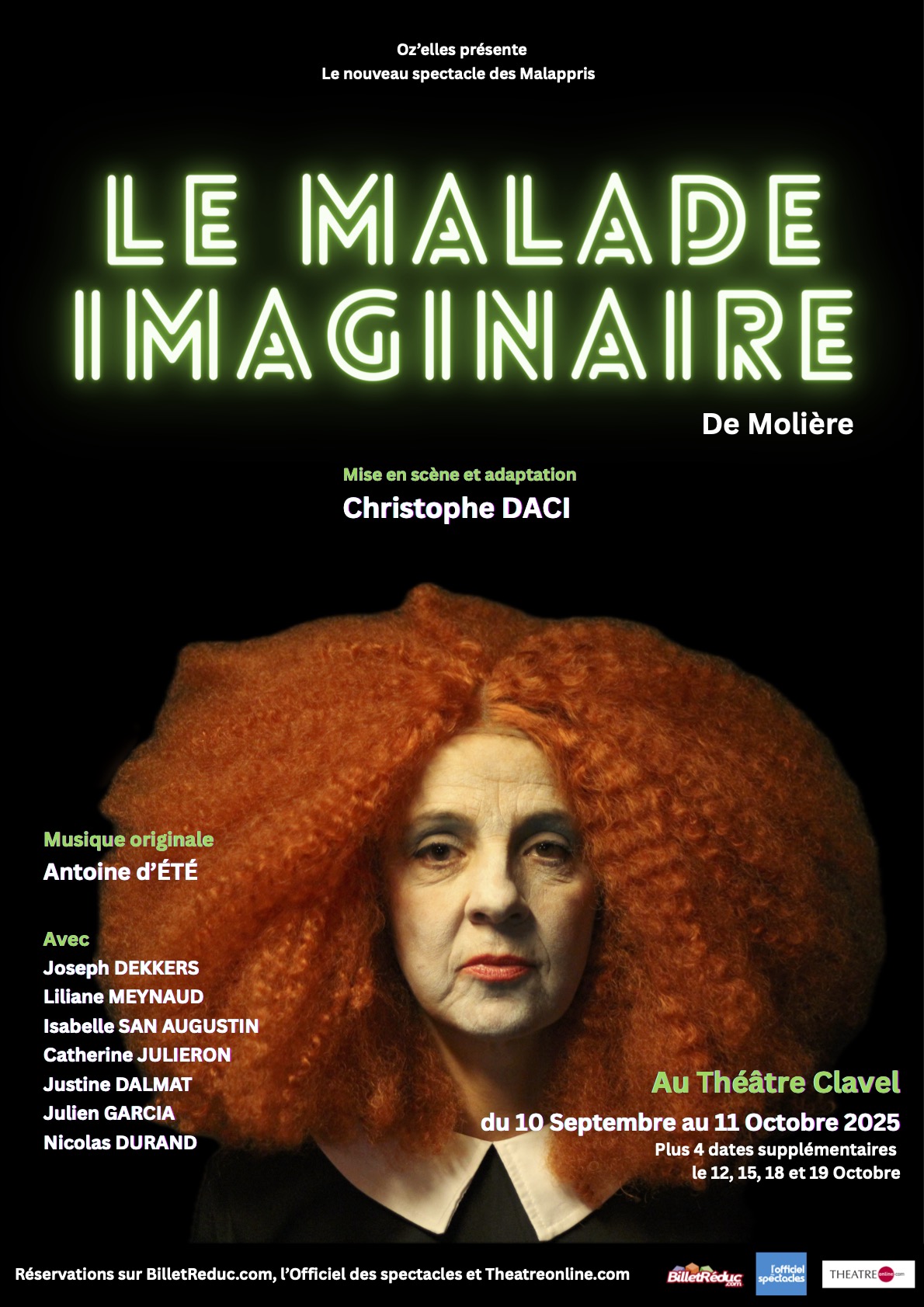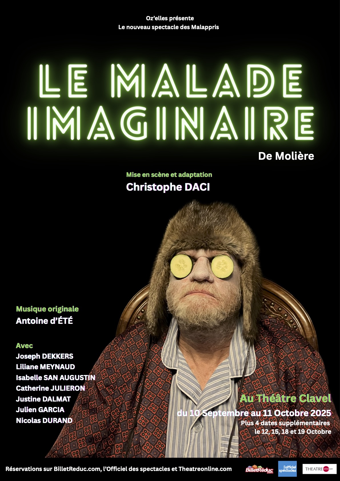 A l’origine la pièce est une comédie-ballet en 3 actes. J’ai choisi de travailler avec le compositeur Antoine d’Été, avec qui je collabore pour la sixième fois, afin de créer une ambiance étrange, proche de l’univers gothique. Antoine a composé un thème orchestral qui se décline en plusieurs versions. Il s’est notamment inspiré de l’un des intermèdes de Marc Antoine Charpentier, compositeur original de la musique de scène du Malade imaginaire, ou encore des compositeurs Nino Rota et Bernard Herrmann.