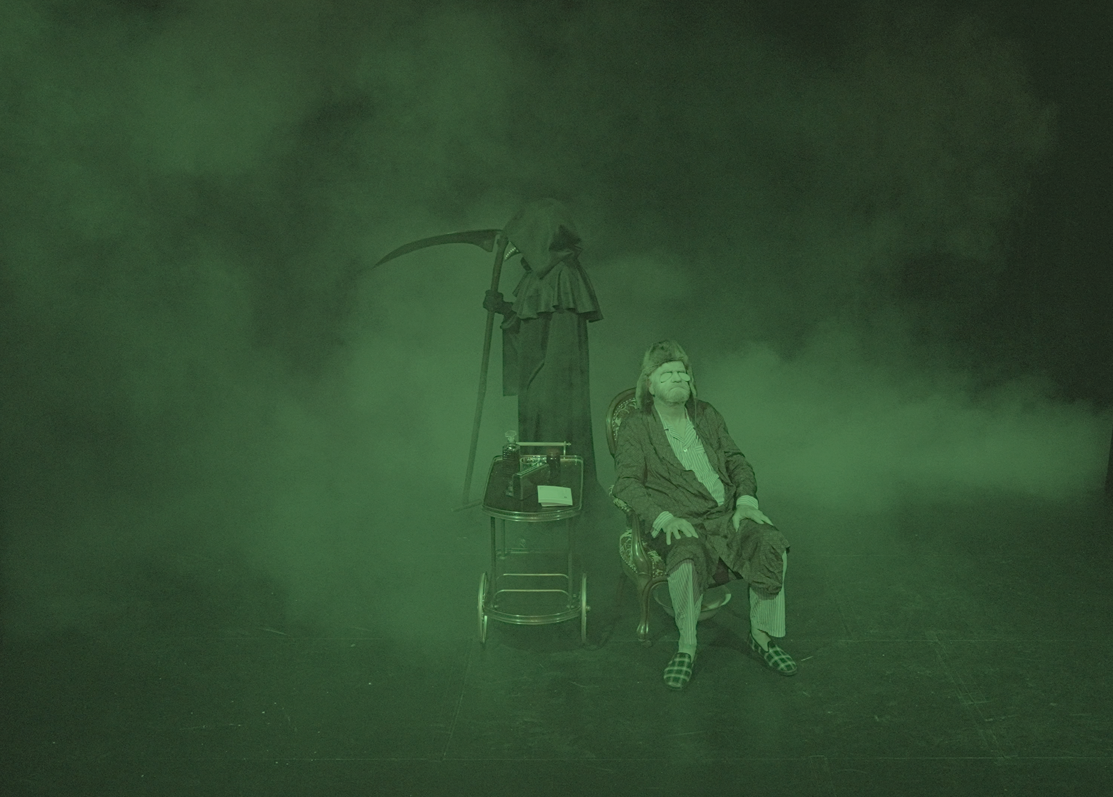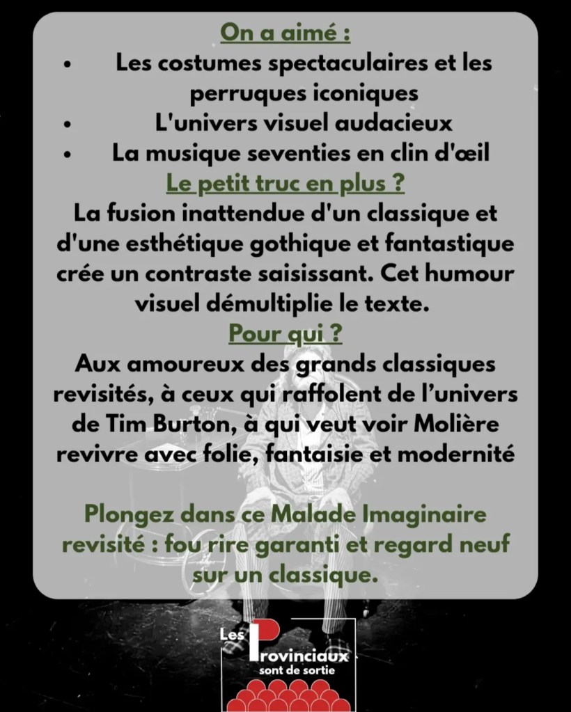 Le rapport à la mort est omniprésent tout au long du spectacle : à travers la maladie et la peur de mourir, le décès de la première femme d’Argan et la menace de suicide des amants, Angélique et Cléante.