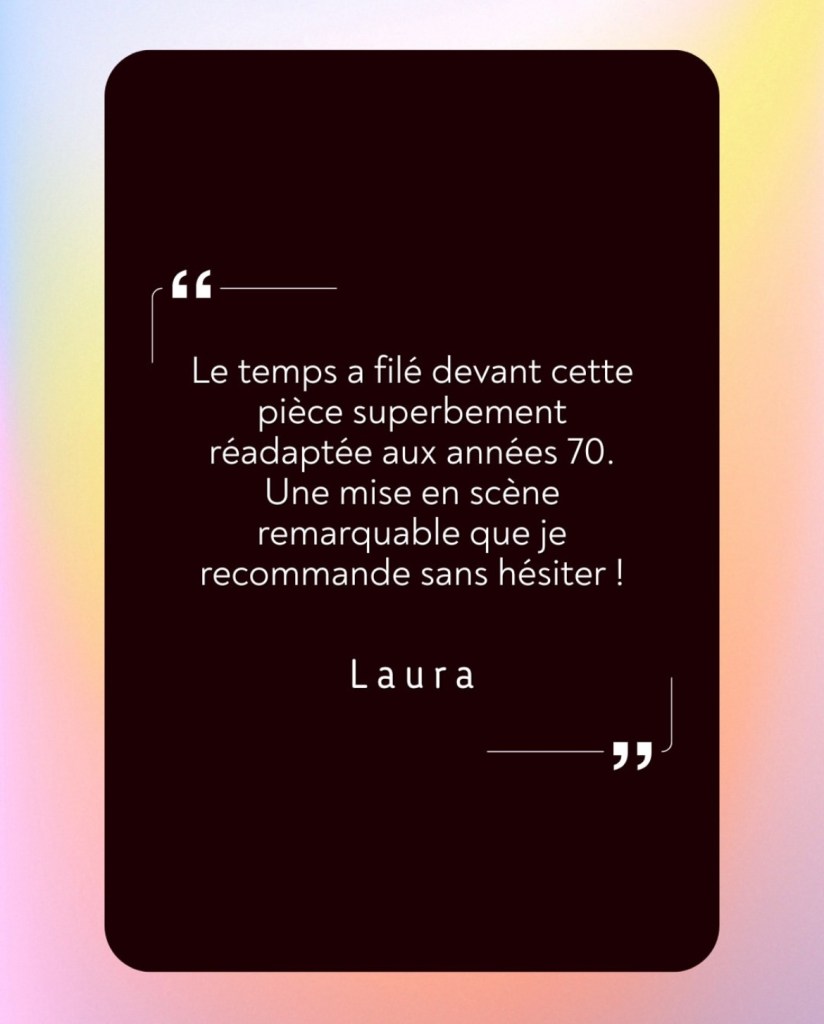 Concernant la condition des femmes, je trouve également pertinent le parallèle, entre 1673 (date de création du texte), le début des années 70 et l’époque actuelle. Au début du spectacle, on entend l’extrait radio d’une émission (1971), où des femmes parlent de leur condition en tant que citoyennes, mères et épouses. On constate que certaines revendications ne sont toujours pas acquises et d’autres remises en question aujourd’hui (comme le droit à l’avortement, ou encore celui de disposer de son corps). Même dans le domaine de la santé, qui résonne directement avec l’univers de la pièce, l’inégalité entre les genres est omniprésente.